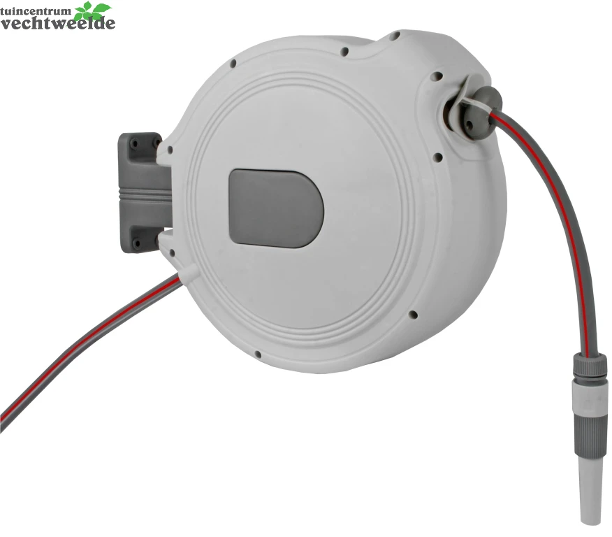 Deze wandslangenbox 15 meter maakt besproeien eenvoudig en comfortabel. De slang kan met weinig inspanning uit de box worden getrokken en vast gezet worden bij elke lengte. Na gebruik kan de slang automatisch worden opgerold. De praktische slangenbox wordt aan de muur bevestigd en is 180 graden zwenkbaar. Voor de winter kan de slangenbox eenvoudig met de handgreep van de houder afgehaald worden voor opslag in een vorstvrije ruimte. De set bestaat uit: 15 meter lange slang, 1 meter lange aansluitslang, 1x verstelbare tuinspuit, 1x slangkoppeling 1/2?, 1x slangkoppeling met waterstop 1/2? en 1x kraannippel. De wandslangenbox is bovendien voorzien van een slanggeleider, deze geleidt de slang, zodat deze gelijkmatig en netjes wordt opgerold.